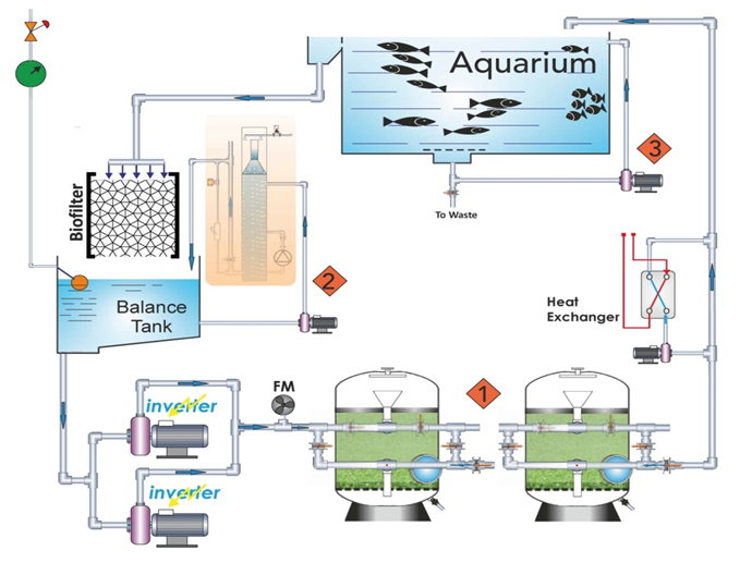 而維生系統(tǒng)根據(jù)水族館內(nèi)生物的生活習(xí)性設(shè)置觀賞水體的配水把控潔凈度、水溫、消毒方式、Ph值、食物投放等。戴思樂魚和無脊椎動物水族館LSS設(shè)計通過先進的水流動力學(xué)設(shè)計,將循環(huán)過濾、反沖洗排于首位,保障水質(zhì)潔凈的同時還能解決能耗與運行成本高的問題,并且水質(zhì)進行實時監(jiān)測,根據(jù)水棲哺乳動物的呼吸方式提出實測三氯化氮、臭氧濃度,避免影響水棲哺乳動物的呼吸系統(tǒng),然后將AFM濾料作為過濾介質(zhì),它具備抗生物侵蝕的特性,能夠抑制濾床的細菌生長,并且不會板結(jié)。